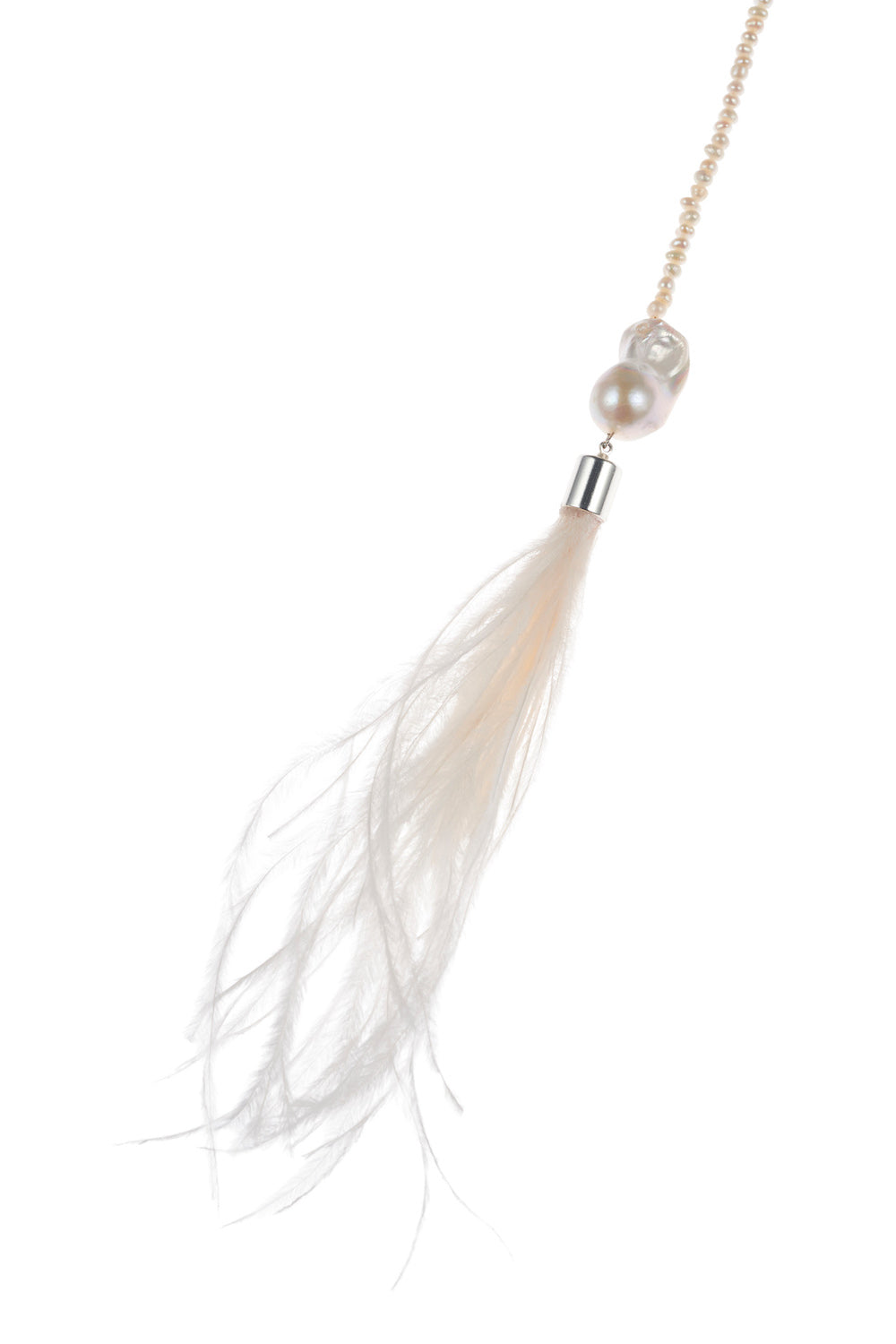 Ostrich feather, swarovski crystal and baroque pearl wrap necklace plated in rhodium.